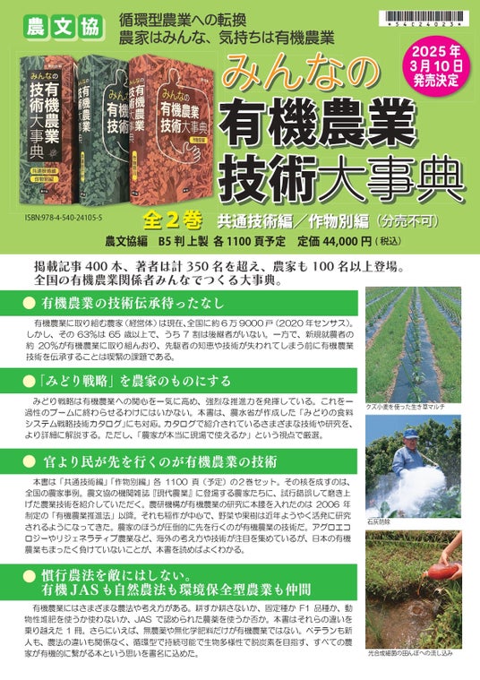 掲載記事 400 本、著者は計 350 名を超え、農家も 100 名以上登場。全国の有機農業関係者みんなでつくる大事典。共通技術編/作物別編 各1,100ページの大ボリュームでお届けする『みんなの有機農業技術大事典 共通技術編・作物別編』(農山漁村文化協会 2025年3月10日刊行予定)