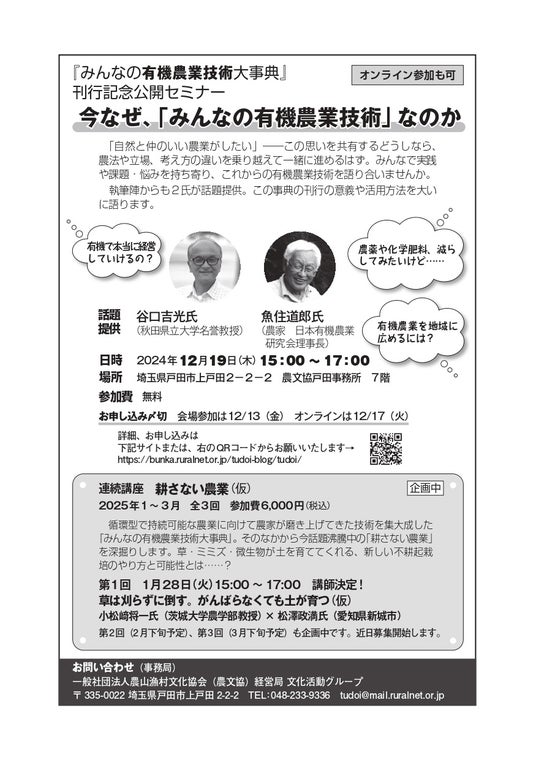本書の発売を記念して、刊行記念公開セミナー『今なぜ、「みんなの有機農業技術」なのか』が2024年12月19日(木)15:00-17:00に開催されます。オンライン参加の申込は12月7日(土)締切。お早めにお申し込みください!