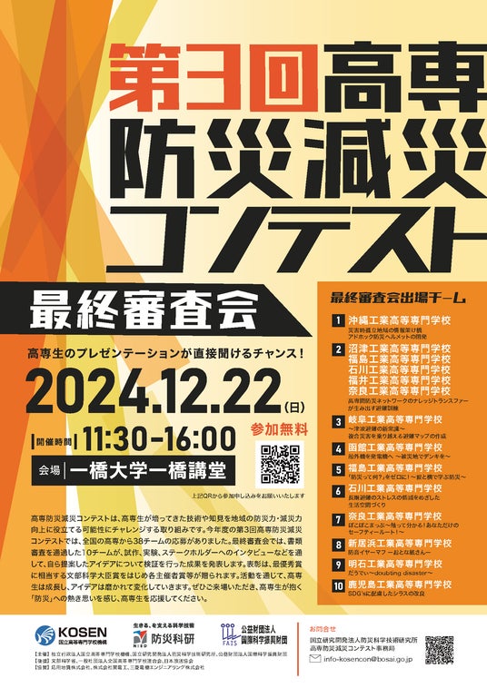 独立行政法人国立高等専門学校機構(東京都八王子市、理事長:谷口功)は、国立研究開発法人防災科学技術研究所(茨城県つくば市 理事長:寶馨)及び公益財団法人国際科学振興財団(茨城県つくば市 会長:住川雅晴)との共催で、2024年12月22日(日)に一橋大学一橋講堂(東京都千代田区一ツ橋2-1-2 学術総合センター内)で「第3回高専防災減災コンテスト 最終審査会」を開催します。