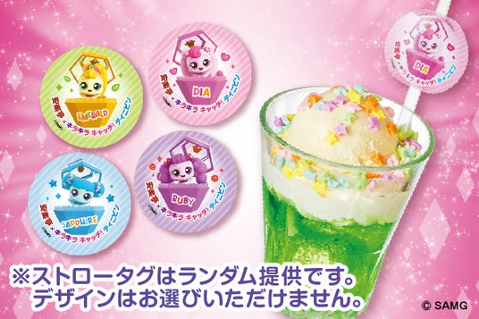 そして、めいっぱい焼肉キャッチ!をたのしんだデザートには「キラキラクリームソーダ」をご用意。物語のキーアイテムである宝石のキラキラを描いたクリームソーダのストローには、ロイヤルティニピン「ハチュピン」「ココピン」「ニコピン」「マコピン」を配したタグ付き!