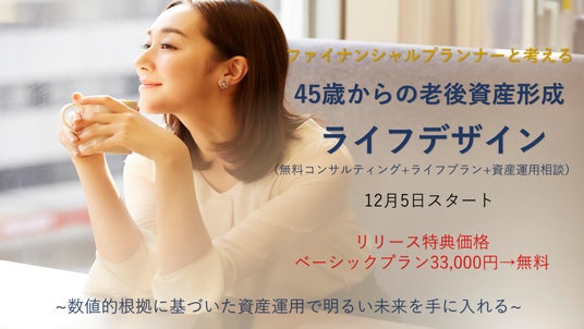 2024年12月5日より、老後のお金の不安を感じている45歳~の方へむけて、無料コンサルティングとライフプラン作成、資産運用の相談がセットになった「ライフデザイン」を特別価格にてリリースいたします。(ベーシックプラン33000円→無料)目的に沿った、数値的根拠に基づいた資産形成をすることでお金の不安を解消し、明るい未来を手に入れることができます。