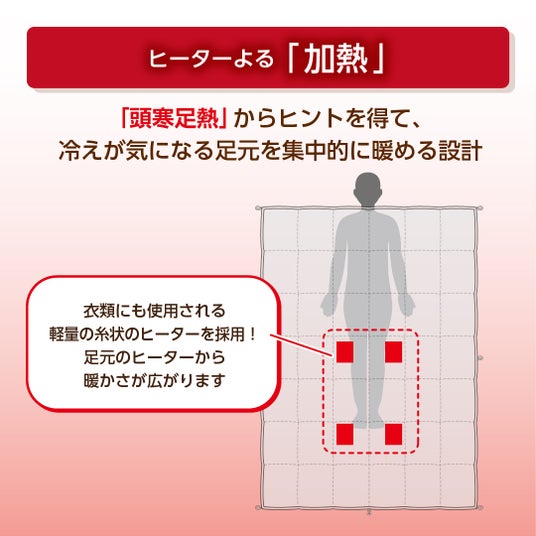 衣類にも使用される軽量の糸状ヒーターを採用。足元のヒーターから全身に暖かさが広がります。