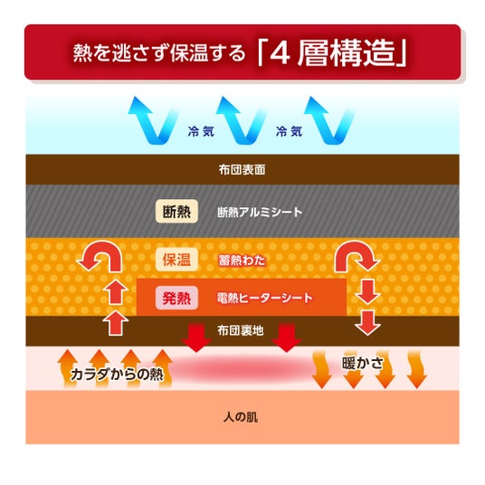 足元のヒーターから出た熱を蓄熱わたで包み込んで保温し、断熱アルミシートによって暖かい空気を布団の中に閉じ込めます。表面にはふんわりとした起毛生地を使用しているため、肌触りもなめらか。布団に入った時のヒヤッとする嫌な感じが一切ありません。