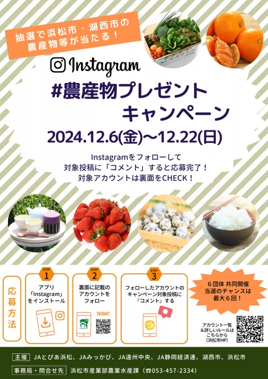 「浜松市」が運営するインスタグラムアカウント”はまのう”と、「湖西市」、「JA静岡経済連」、「JAとぴあ浜松」、「JAみっかび」、「JA遠州中央」は共同で、浜松・浜名湖地域の農産物等が当たるプレゼントキャンペーンを実施します。