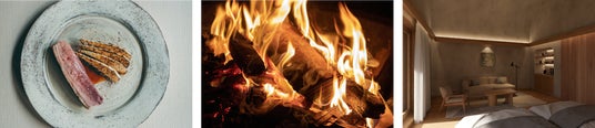 当日は、アーリーチェックインにて山麓で開催されるイベントを自由散策した後、17:30より宿泊者専用のラウンジへご案内。特別にシャンパーニュ(フリーフロー)にあわせたピンチョスのビュッフェをご提供いたします。その後、祭典を盛り上げる奈良礼賛大花火、またクライマックスの御神火の一斉点火から始まる山焼き。すべてお食事を楽しみながら、一望いただけます。お料理のメインは、オープンキッチンが主役のレストランへご移動。若草山の山焼きに着想を得たオーダーメイドの薪台を構え、原始的な薪火を熱源に料理に仕上げていきます。