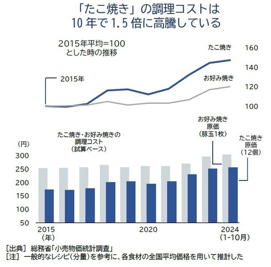 粉もん店の経営は、小麦粉や卵など原材料のほか、人件費、電気代など店舗運営コストの上昇に加え、特に粉もん料理の代表格である「たこ焼き」で欠かせない「タコ」の価格高騰が大きな打撃となった。各種統計情報やレシピ情報を参考に、家庭でのたこ焼き調理にかかる原材料コストを試算した結果、2024年平均ではたこ焼き12個あたり250円以上かかる試算となった。約170円だった2015年平均に比べると、食材価格だけでコストは1.5倍に増加した。豚玉を中心としたお好み焼きでは、2024年平均で300円を超え、10年間で1.2倍に増加するなど、総じて原材料コストの大幅な増加が続いている。
