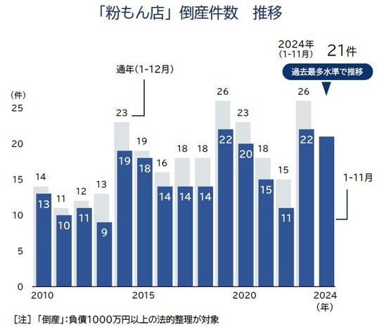 「粉もん店」の苦境が続いている。2024年に発生した飲食店や持ち帰り料理店のうち、お好み焼きやたこ焼き、焼きそばなど「粉もん店」経営業者の倒産(負債1000万円以上、法的整理)は、11月までに21件発生した。過去最多の前年(26件)と同等のペースで推移しており、水面下の閉店や廃業などを含めれば、実際にはより多くの粉もん店が市場から退出したとみられる。