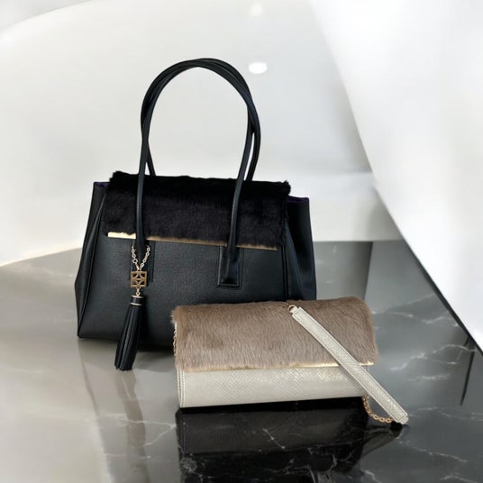 ARIANNA:フラップ付ショルダーバッグ(ブラック、ブラックファー)¥206,800、TALA:チェーンストラップ付クラッチバッグ(アイボリー、ベージュファー)¥99,000