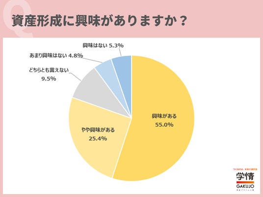 株式会社学情(本社:東京都中央区)は、20代の仕事観や働く意識をひも解くために、アンケート調査を実施しました。今回は、「資産形成」に関して調査。「資産形成に興味がある」と回答した20代が8割を超えました。「仕事以外の収入源を持っておきたい」「“もっと早く始めていれば良かった”という声を聞くので、20代のうちに始めたい」「老後の年金に不安がある」といった声が上がっています。一方、「資産形成を行っている」と回答した20代は約4割に留まりました。「難しそうな印象があり、実際にはまだ始められていない」「リスクも伴うので、きちんと知識を習得してから始めたい」といった声が寄せられています。また「FIRE(早期リタイア)」について、半数以上の20代が「興味がある」としています。「興味はあるが、現実的ではないと考えている」「仕事をせずに生活できるのは魅力的だが、仕事も生きがいの1つにしたい」といった声が上がりました。