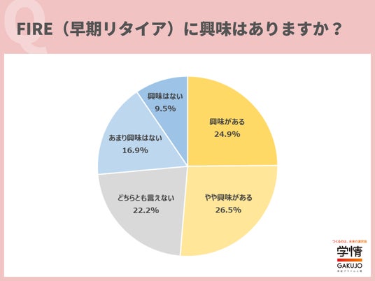 「FIRE(早期リタイア)」に「興味がある」と回答した20代が24.9%に上りました。「やや興味がある」26.5%を合わせると、半数以上の20代が「FIRE」に興味があるとしています。「興味はあるが、現実的ではないと考えている」「早期リタイアよりも、自分のペースで仕事をして必要最低限の収入を得るセミリタイアを実現したい」「仕事をせずに生活できるのは魅力的だが、仕事も生きがいの1つにしたい」といった声が上がりました。