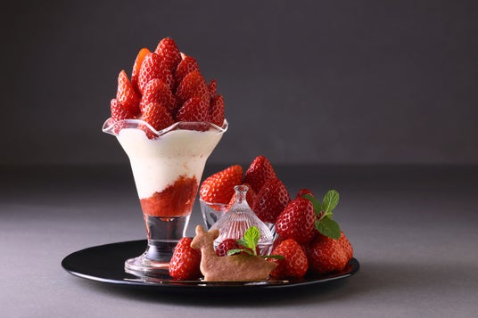 今回のフェアでも土耕栽培や有機肥料にこだわる奈良県天理市の“中井農園”で収穫されたいちごのみを使用。奈良県オリジナル3品種「古都華」「ならあかり」「アスカルビー」を使い、シンプルな「古都華パフェ」、いちごを20個以上使った「古都華パフェ いちごDX」、さらにいちごを増量した「古都華パフェ スーパーDX」をご用意します。産地ならではの鮮度の高さと艶やかな一粒一粒をお楽しみください。