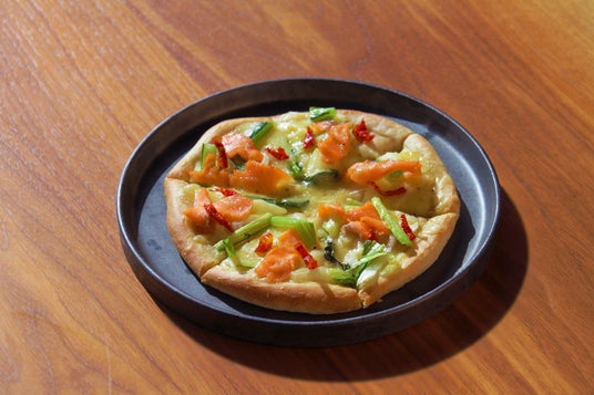 ウイスキーの製造過程で生まれる副産物の一つであるドラフ(麦芽粕)を使用した生地に、旬の食材をのせて焼き上げた小諸蒸留所ならではの自家製ピザ、KOMORO SEASONAL PIZZA -SHINSHU SALMON & NOZAWANA-