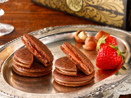 風味豊かな2種類のソースをミルクチョコレートでコーティングし、さっくりと焼き上げたココアクッキーでサンドした、贅沢な味わいのショコラサンドです。 濃厚なヘーゼルナッツクリームと、爽やかな酸味のストロベリーソースの2つの味のアソートで。