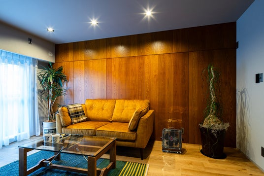 大判で表情豊かな木目と艶感が美しいウッドパネルはダルトンホームのオリジナル建材。調光も可能なダウンライトの光がパネルにあたり、重厚感のある落ち着いた空間に。