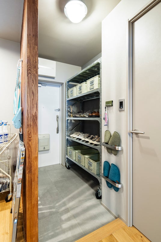 玄関には、店舗什器として使用されているダルトンのガルバナイズドシェルフをシューズラックとして大胆に活用。無骨な雰囲気が漂うシェルフは玄関の顔として一役買ってくれます。収納ボックスと組み合わせれば、使い勝手の良いシューズラックに。