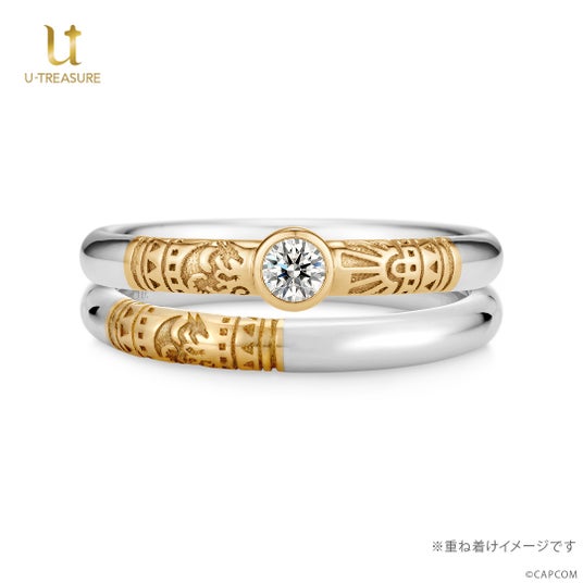 「モンスターハンター」シリーズ エンゲージリング(婚約指輪)。ダイヤモンドが中央に輝き内側にはモンスターの刻印と宝石をあしらったデザイン