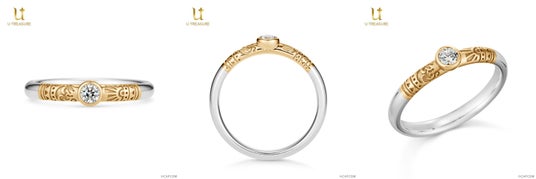 このたびの新作は、加工の難易度が高いフクリン留めを採用したダイヤモンドが輝くエンゲージリング(婚約指輪)です。内側にモンスターの刻印とカラーストーンをあしらった、別売りの「ハンターの指輪」との重ね着けも楽しめるデザインです。