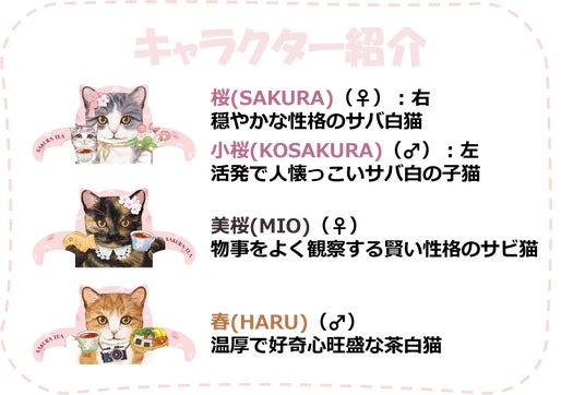 3匹の猫は、一般的に人当たりが良く穏やかな性格と言われている和猫の、サバ白猫・サビ猫・茶白猫を採用。自由奔放で、1日の大半を温かい場所で寝て過ごしています。猫の名前も桜に関連する漢字にすることで、より“日本らしさ”を感じていただけるように名付けました。