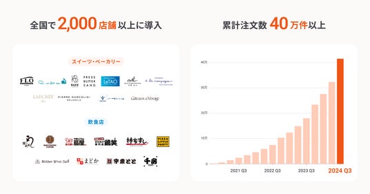 現在、「テイクイーツ」は全国2,000店舗以上で導入され、累計注文回数は40万件を突破しています(2024年11月時点)。