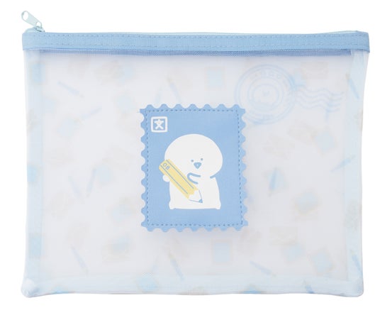 中央には切手風のデザインのアップリケ、メッシュ部分にはお手紙に関するイラストが散りばめられた可愛いポーチです。
