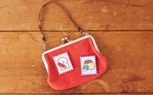 切手型バッジをポーチに付けたイメージ