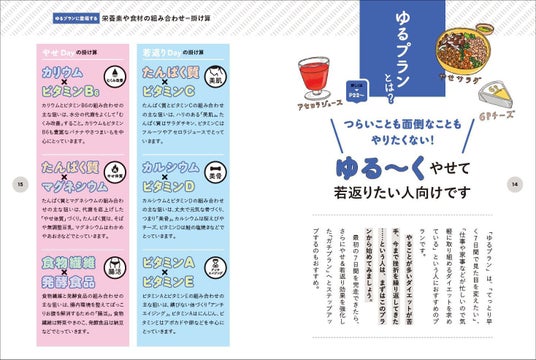 「ゆるプラン」に登場する栄養素の掛け算は、例えば若返りには「たんぱく質」×「ビタミンC」、やせるためには「カリウム」×「ビタミンB6」など、全部で6つの栄養素の掛け算を元に組み立てた献立になっています。なんだか難しそうと思った人も心配はいりません。「ゆるプラン」はチャレンジのしやすさにこだわり、どれもコンビニなどで簡単に手に入り、買って、開けて、並べるだけですぐに食べられるものばかりです。忙しい朝は、パン類、フルーツなど調理するものはなし。昼もおにぎり、鮭の塩焼きなどコンビニやスーパーでそろうものがメインです。夜ごはんの「やせサラダ」「若返りサラダ」も、基本は食材を切って盛るだけで、自炊をする時間がない人、料理が苦手な人でもすぐに取り組めます。シンプルな献立だからこそ、飽きずに取り組めるように、パンやごはんの種類は変えたりして工夫しています。