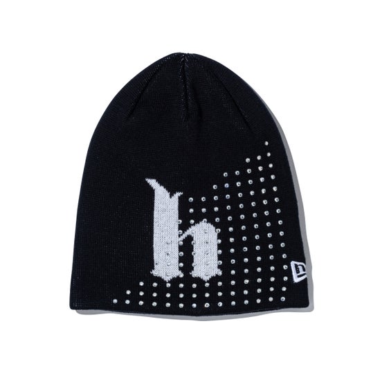 ジャガードで表現した<hood>の頭文字である「h」ロゴの上に、大きめなラインストーンをあしらっ