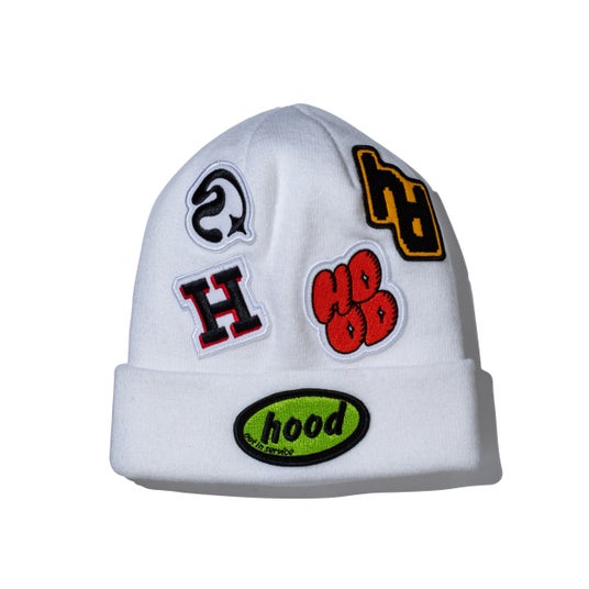 通常より少し小さめのポンポンを付けたニットキャップのフロントには、<hood>のブランドロゴを