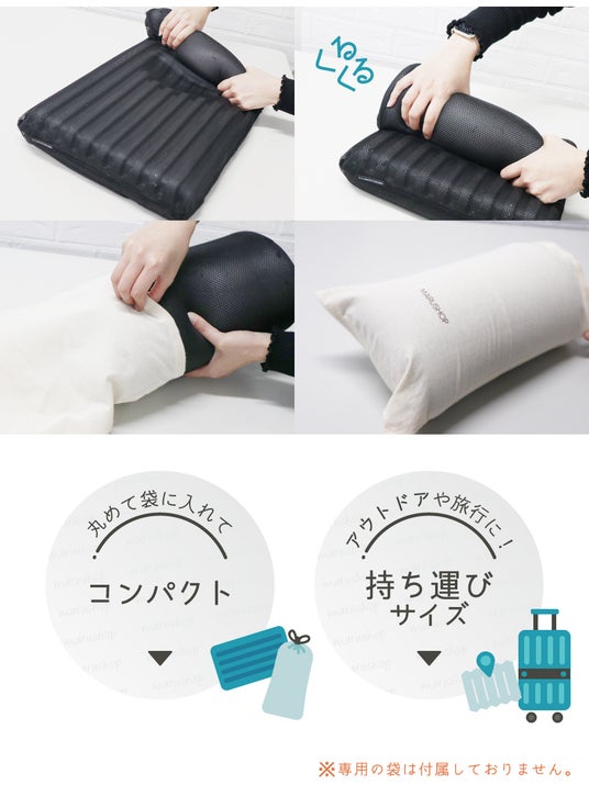 くるくる丸めて持ち運び便利くるくるコンパクトにして旅行用やオフィスでのお昼寝用にも快適に使うことが出来ます。万能型まくらである理由です。