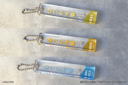 ひいらぎ寮のルームキーをイメージした「大友寿&土屋真央」、「菊地原仁&市川義一」、「稲葉礼&吉乃詩音」の3組のカップリングアクリルキーホルダー。