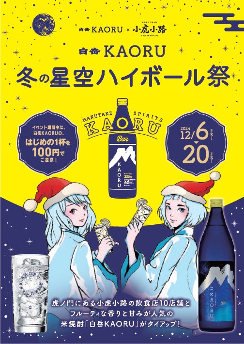 高橋酒造株式会社およびG-FACTORY株式会社は、12月6日(金)から12月20日(金)の期間中、“オフィス街ではしご酒を気軽に楽しめる横丁”として人気急上昇中の虎ノ門「小虎小路」にて、「白岳KAORU 冬の星空ハイボール祭」を開催いたします。