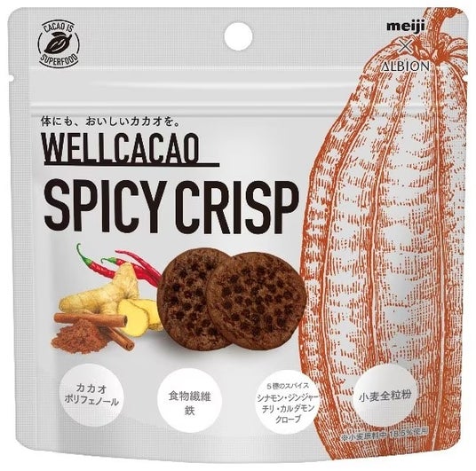 古代カカオドリンクを彷彿とさせる、カカオに黒糖やシナモン、チリ等を加えひとくちサイズに焼き上げた、甘さ控えめのクラッカー。スパイス感とサクッとした食感がクセになるおいしさ。明治独自素材「カカオグラニュール」を配合し、カカオポリフェノール、食物繊維、鉄、小麦全粒粉を含み、香料不使用でヘルシーな栄養を手軽に摂取できる商品です。