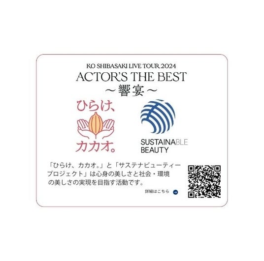 商品には「ひらけ、カカオ。」×「サステナビューティープロジェクト」のオリジナルステッカーを貼付。ライブツアーに参加していただくことで、楽しさとともに持続可能な調和社会の実現に向けての取り組みを身近に感じていただける機会を多くの方々にお届けいたします。