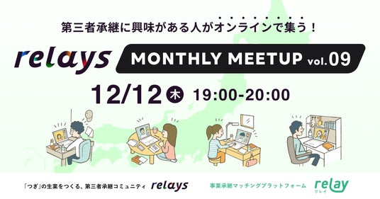 【今年最後のオンライン交流会】第三者承継コミュニティ「relays(リレイズ)」、「relays MONTHLY MEETUP vol.9」開催決定!12月12日(木)開催。