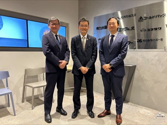 日本テトラパック株式会社 常務取締役 本木 隆一郎 (写真右) ゴールドパック株式会社 代表取締役社長 宇治 俊雄 (写真中央) 芙蓉総合リース株式会社 常務執行役員 川端 恵一 (写真左)