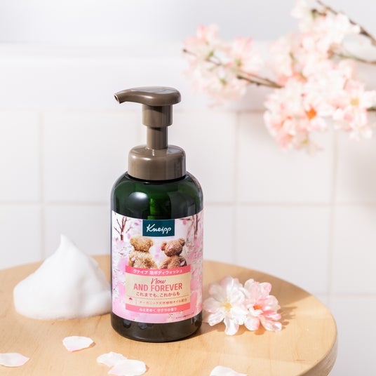 新生活がスタートする方も多く、気持ちが不安定になりがちな春のシーズンに、やさしい甘さのサクラの香りに包まれてリラックスしませんか。ピンクを基調に、クマがデザインされた可愛らしいパッケージなので、プレゼントとしても喜ばれるはず。「Now and forever / これまでも、これからも」のメッセージ付きなので、日頃お世話になっている方へのギフトに最適です。昨年は、詰め替え用とのセット販売が中心でしたが、今年はボトル本体のみを全国のドラッグストア、バラエティストア、クナイプ公式オンラインストアにてより手軽にお買い求めいただけるようになりました。