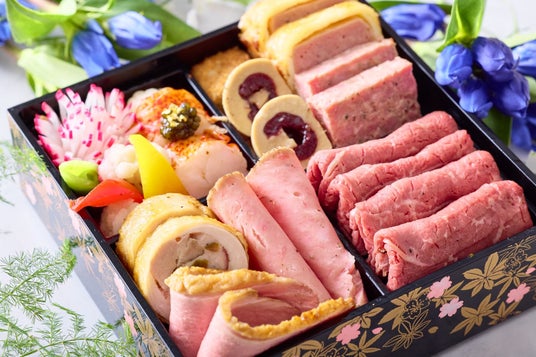 栗きんとん(金運)/黒豆(勤勉)/数の子 おぼろ昆布巻き(子孫繁栄)/蟹真丈(子宝)/鯛の柚庵焼き(めでたい/よろこぶ)/祝い海老艶煮(長寿)/穴子の八幡巻き(末永い幸せ)/蝦夷鮑のやわらか煮(不老長寿)/サーモンマリネ 大根巻き フレンチキャビアを添えて/蛸とあおさ刻みワサビ和え(多幸)/国産鶏の松風焼き