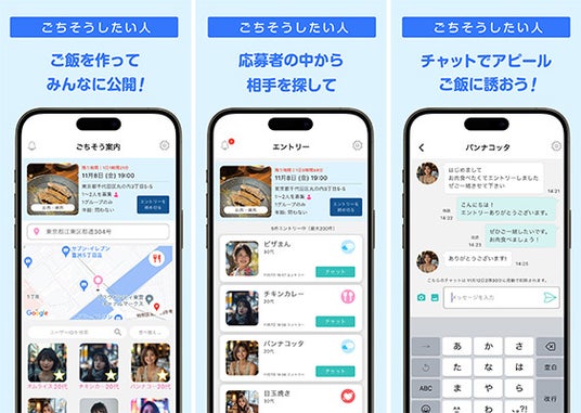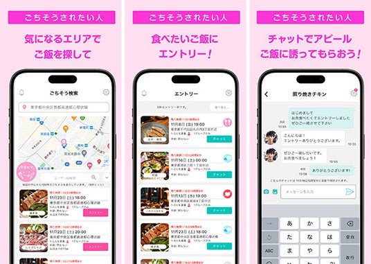 ごちそうされたい人は食べたいご飯を探し、気に入ったご飯を見つけてエントリー。お互いチャットで連絡し、気が合えば一緒に食事する流れになります。