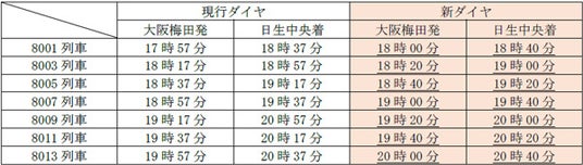 (2)18:10~20:30まで川西能勢口駅を出発する下り普通列車(日生中央行き)について、急行大阪梅田駅行き(上り列車)と新たに13本接続します。