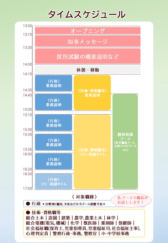 ●内 容:山下知事メッセージ、各職種の業務説明(ブース形式)、採用試験の概要説明など