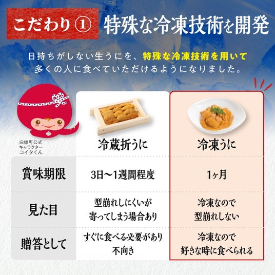 そこで、イミューのシラリカ工場に有している特殊冷凍技術を活用、ウニを加熱せずに生のまま冷凍することに成功しました。この「冷凍生うに」は、家庭で解凍すると新鮮な生の味わいが蘇り、冷蔵保存では3日から1週間程度しか持たない生うにの賞味期限を1ヶ月に延ばすことができました。さらに、配送中の型崩れの心配もなくなり、贈答用としても安心してお使いいただけます。