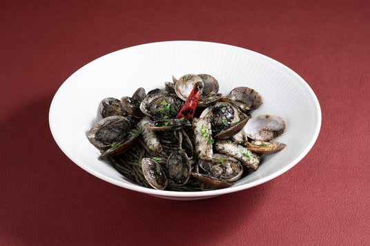 旨みが凝縮した「あさり」とコクのある「イカスミ」の風味をにんにくの香りが一層引き立てる、味わい深い一品。
