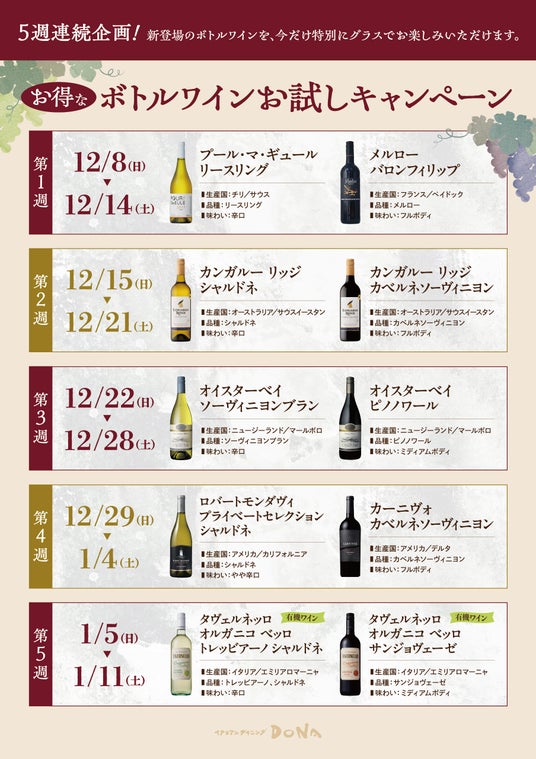 また、新登場のボトルワインを気軽にお楽しみいただけるよう、12月8日(日)より「ボトルワインお試しキャンペーン」を開催!週替わりでおすすめのワインをグラスでご提供いたします。