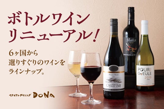 本格イタリアンに相応しいボトルワインのラインナップへと刷新。イタリア、フランス、オーストラリア、ニュージーランド、チリ、アメリカの6ヶ国から厳選したワインを取り揃えました。