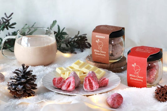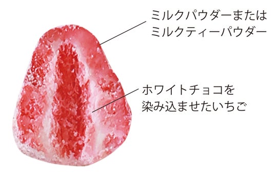 当商品は、フリーズドライしたいちごにホワイトチョコを染み込ませたスイーツで、いちごの甘酸っぱさとホワイトチョコのまろやかな甘みや、そこにまぶしたミルクパウダーやミルクティーパウダーとのマリアージュが楽しい一品です。