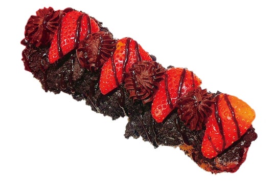 シュガーグレーズをまとった生地にロータスクッキーとチーズクッキークランチをトッピング、ヘーゼルナッツ入りクリームを加えた贅沢な一品。中央には雪だるまに見立てたマシュマロをのせ、イチゴと赤色でクリスマスらしい華やかさを演出。