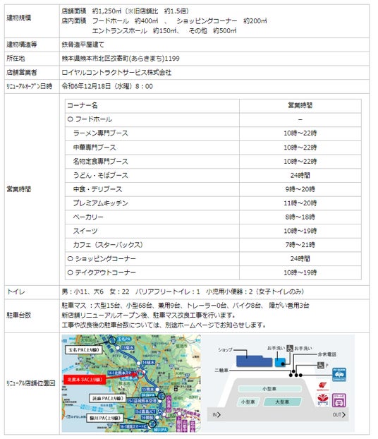 建替工事を実施しておりました北熊本SA(上り線:福岡方面)の店舗およびトイレ建物を、令和6年12月18日(水曜)朝8時にリニューアルオープンします。