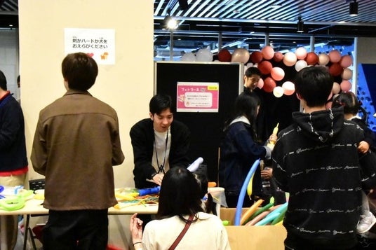 バルーンアートのプレゼントコーナーに多くの人が集まり、状況に応じてサポートに入った