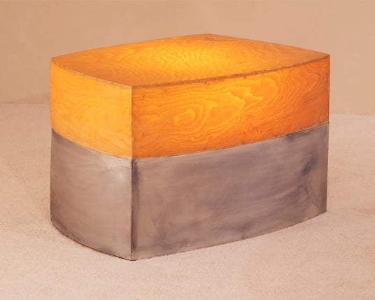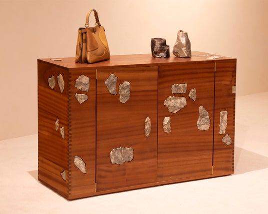 硬いサペリ材を用いたキャビネット。ボックスジョイントが四つの側面をしっかりと固定するだけでなく、真鍮とアルミニウム製の連結した「FF」ロゴをまとめる役割も担っています。アラバスターの破片が表面に埋め込まれており、ローマの彫刻に見られる主要な素材へのオマージュとなっています。