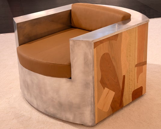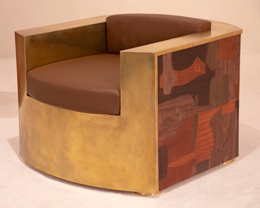 クラブ チェアは光沢のある真鍮製で、暗い色の木材でベニヤ仕上げが施されています。パッチワーク部分はフェンディのアトリエにあるジャケットの型紙をアレンジしたもので、その中に「FF」ロゴモチーフが組み込まれています。